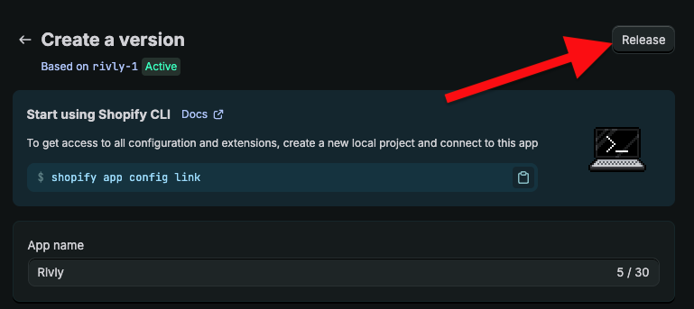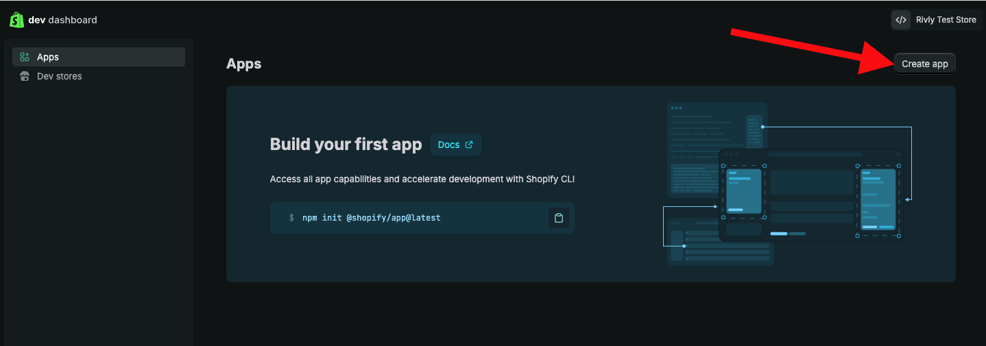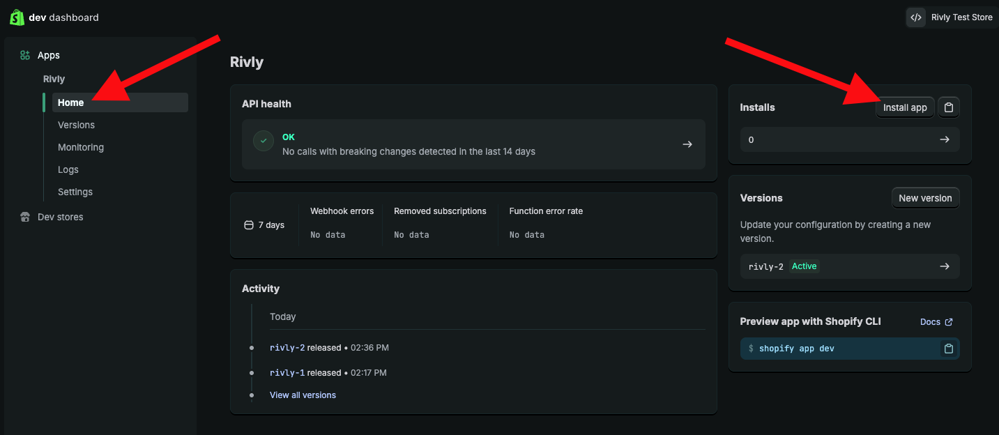 App was not installed - Sometimes sellers can forget to install their newly created app into their store. If you go to the dev dashboard and select this new "Rivly" app, you should see that the install count says 1 (for your 1 store). If the count says zero, you have to click to install app as seen below.