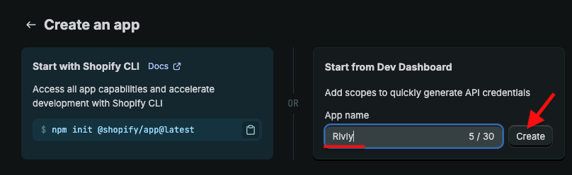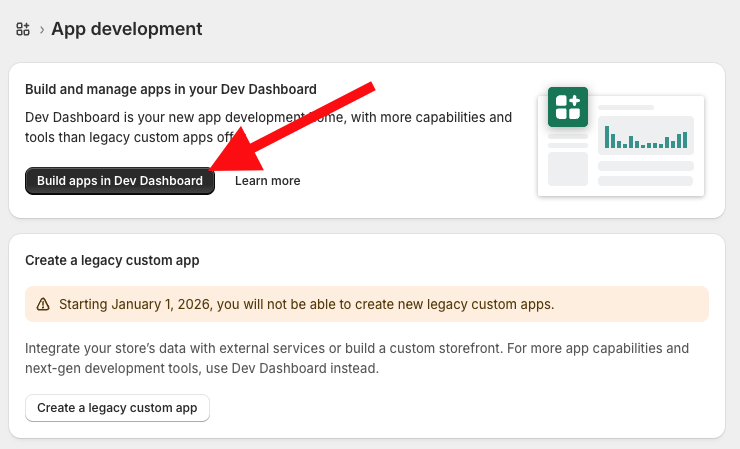 - Now click to "Build apps in Dev Dashboard" which will open the Dev Dashboard for you