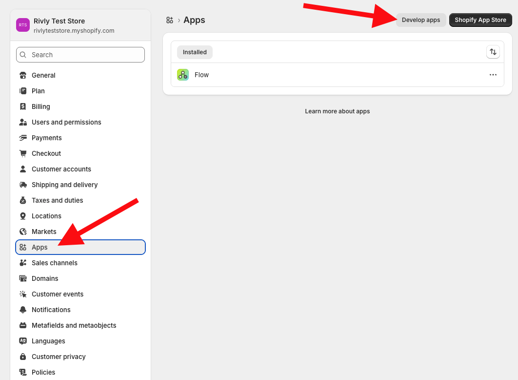 While in your Shopify dashboard, head to your "Settings" menu, then go to the "Apps" page and click "Develop Apps"