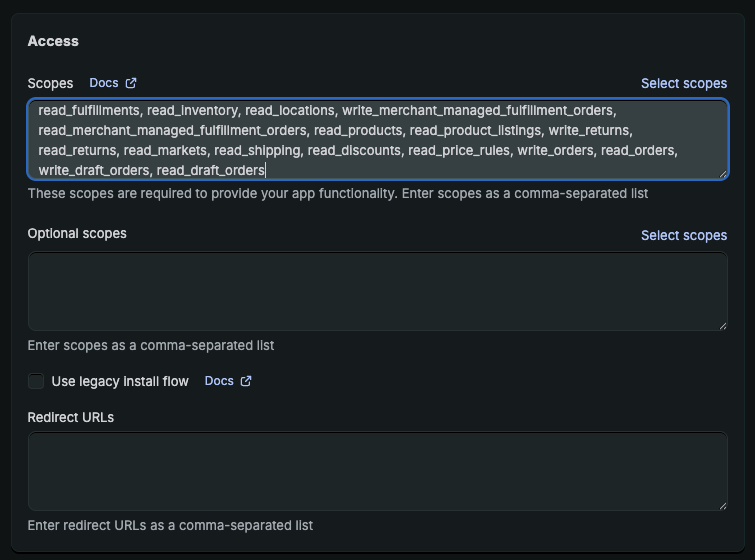read_fulfillments, read_inventory, read_locations, write_merchant_managed_fulfillment_orders, read_merchant_managed_fulfillment_orders, read_products, read_product_listings, write_returns, read_returns, read_markets, read_shipping, read_discounts, read_price_rules, write_orders, read_orders, write_draft_orders, read_draft_orders