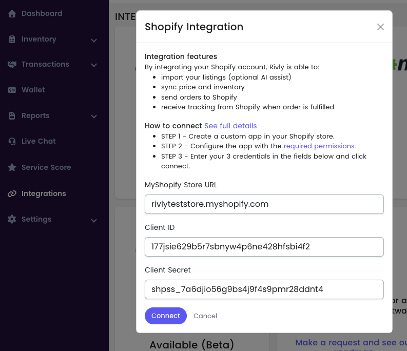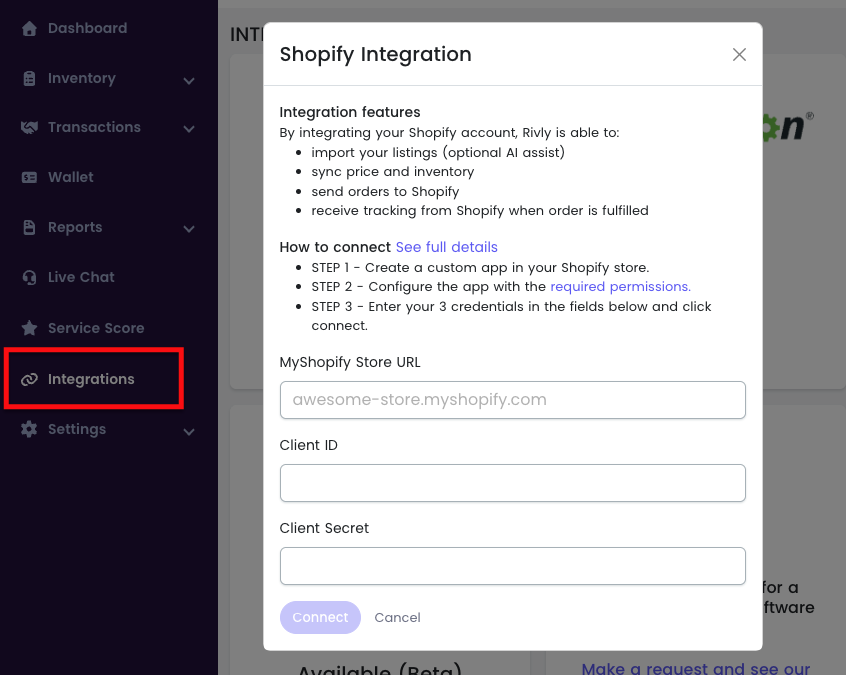 If you're not already, be sure to log in to your Rivly Seller Portal, head to the the Integrations page and click "Shopify" to see the integration connection popup.