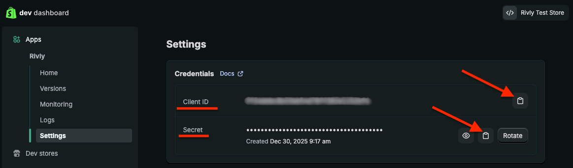 The next 2 credentials are copy/pasted from the Dev Dashboard "Settings" page using the copy button.