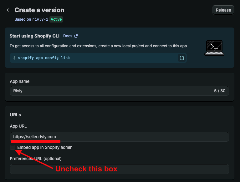 Enter the new App URL "https://seller.rivly.com" AND uncheck the box "Embed app in Shopify admin"