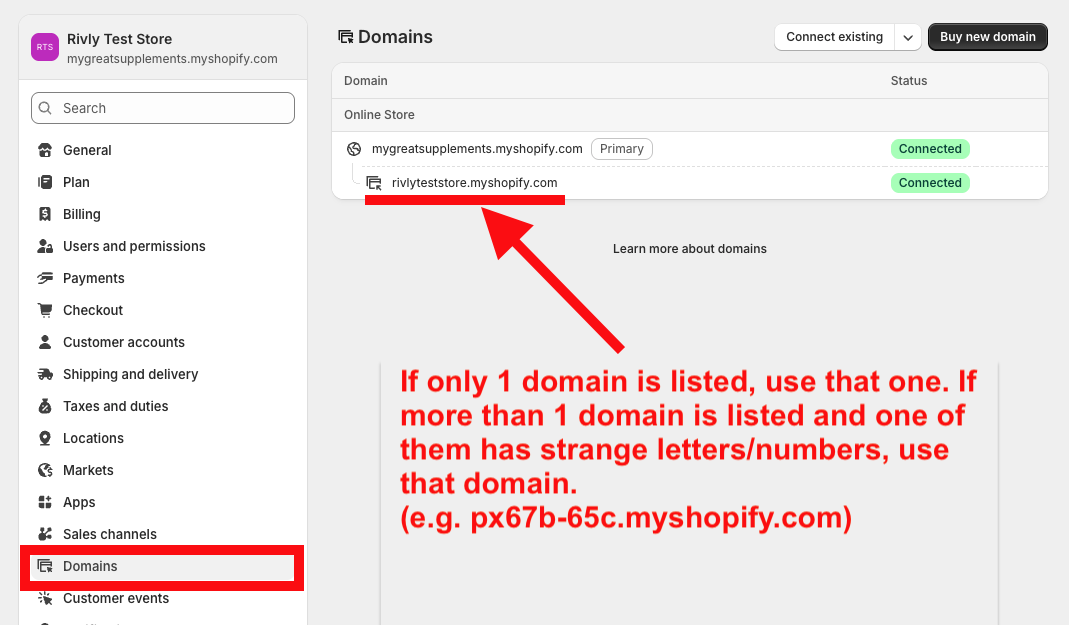 - MyShopify Store URL is incorrect - If you changed your MyShopify store URL at all in Shopify, in order to make the connection to Rivly, you must input your original domain URL that Shopify assigned to your store on creation. If you need to find this, head to your Settings in Shopify and click on Domains page. If you see more than 1 domain listed, use the original one you were assigned. This is often the one with strange letters/number (e.g. pf627x-hr5.myshopify.com)